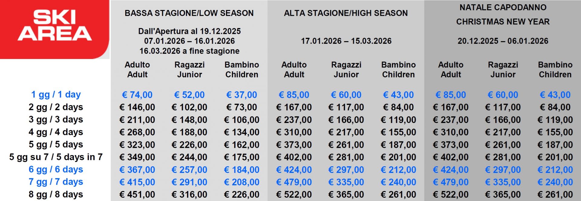 Sie ermöglichen unbegrenzte Abfahrten auf den Liften von Funivie Pejo, Funivie Folgarida Marilleva, Funivie Madonna di Campiglio und Funivie Pinzolo.